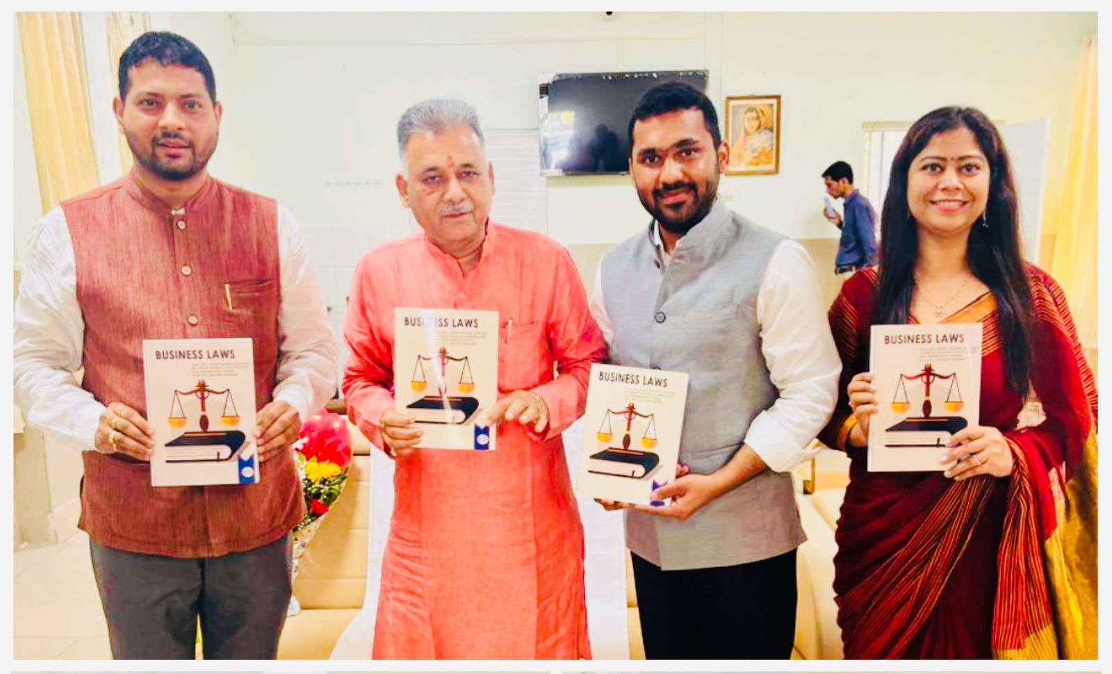 Indore (M.P) In a momentous occasion for the academic community in Indore, the Honourable Shri Inder Singh Parmar Ji, Minister of Higher Education, Technical Education, and AYUSH in the Madhya Pradesh government, unveiled the much-anticipated book “Business Laws.” Authored by an accomplished trio comprising Dr. Punit Kumar Dwivedi, Dr. Neha Sharma Chowdhury, and Adv. Akshanshu Tiwari, this publication stands as a beacon for law students, practitioners, and management professionals alike.