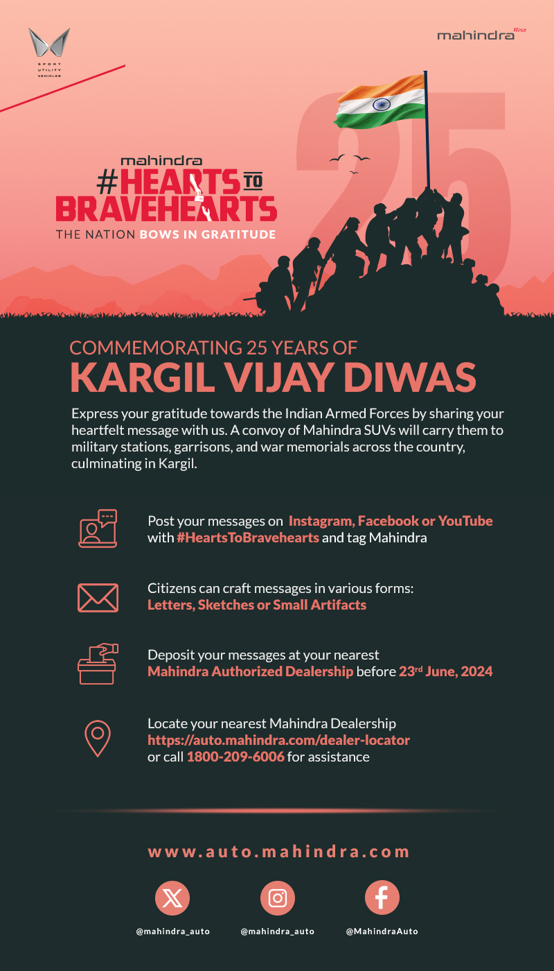 Veejay Nakra, President – Automotive Division, M&M Ltd. said, “We are deeply honoured to commemorate the 25th anniversary of the Kargil victory with our ‘Hearts to Bravehearts’ initiative. This campaign is not just about remembering our heroes but about celebrating the freedom and peace they have secured for us. By sending our heartfelt messages to the brave soldiers who protect our nation, we aim to show them that their sacrifices have not only brought us safety but also endless smiles and a peaceful life. Mahindra is proud to be a part of this significant journey, reinforcing our commitment to exploring the impossible and supporting our nation’s heroes.”